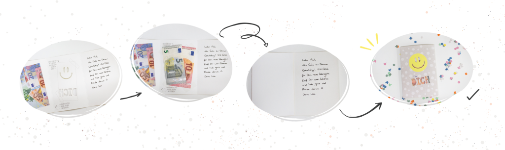 Dazu einfach einen oder mehrere Scheine nach der eingedruckten Anleitung in der Karteninnenseite einkleben und anschließend mit dem bereits an der richtigen Stelle befestigten Klebepunkt verschließen.
