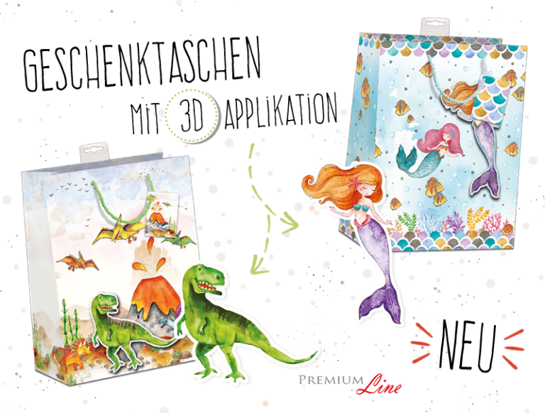 Tauchen Sie ein, in eine magische Welt und entdecken Sie jetzt unsere neuen Geschenktaschen mit 3D-Applikation und schimmernden Folieneffekten.