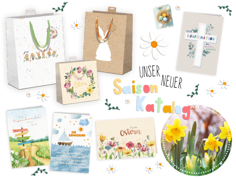 Tauchen Sie mit unserem bunten Saison Katalog in die farbenfrohe Frühlingswelt ein und entdecken Sie Grußkarten und Geschenktaschen zu allen bekannten Anlässen, die diese fröhliche Zeit mit sich bringt.