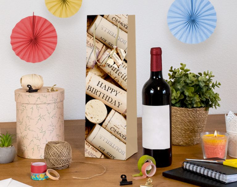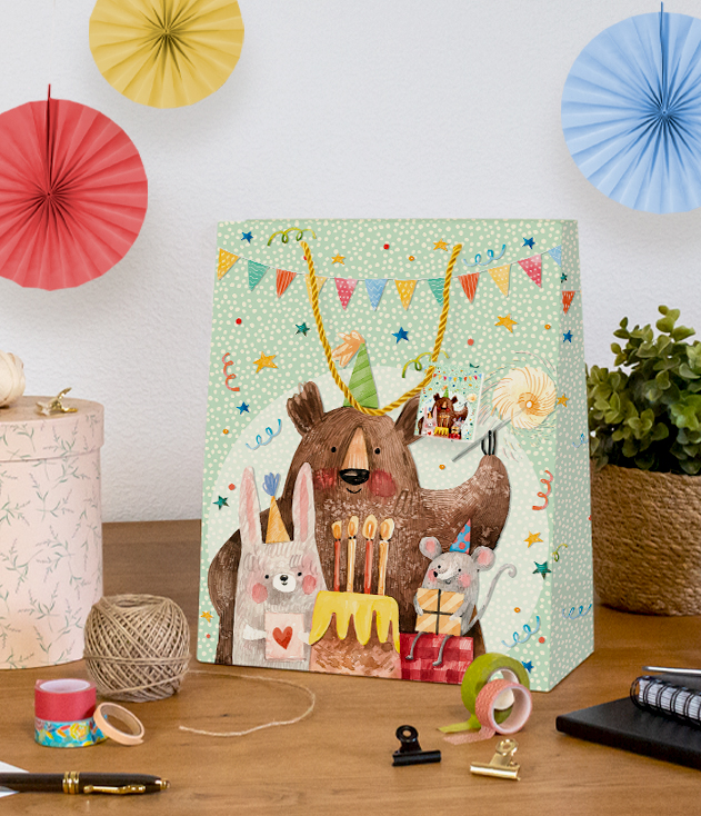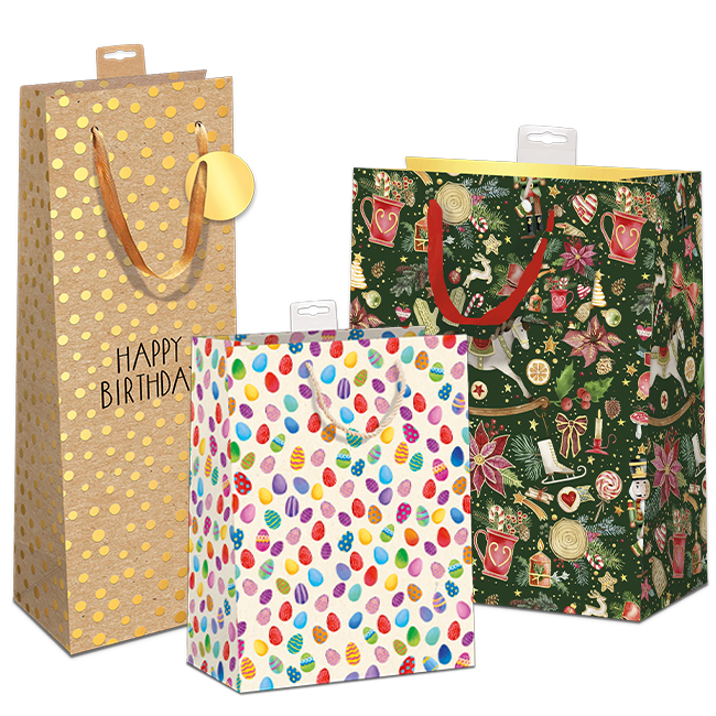 fröhliches Sortiment aus Geschenktaschen, Briefpapieren