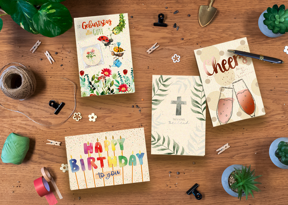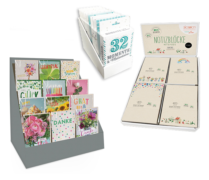 Ganz nach Ihrem Geschmack finden Sie in den unterschiedlichen Kollektionen garantiert die richtige Klappkarte, Geschenktasche, Papeterie oder ein ganzes Drehständerkonzept.